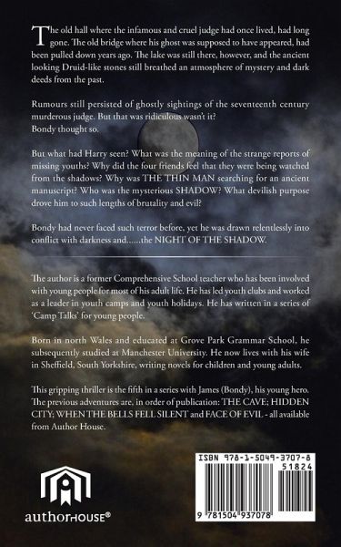The old hall where the infamous and cruel judge had once lived, had long gone. The old bridge where his ghost was supposed to have appeared, had been pulled down years ago. The lake was still there, however, and the ancient looking Druid-like stones still breathed an atmosphere of mystery and dark deeds from the past. Rumours still persisted of ghostly sightings of the seventeenth century murderous judge. But that was ridiculous wasn't it? Bondy thought so. But what had Harry seen? What was the meaning of the strange reports of missing youths? Why did the four friends feel that they were being watched from the shadows? Why was THE THIN MAN searching for an ancient manuscript? Who was the mysterious SHADOW? What devilish purpose drove him to such lengths of brutality and evil? Bondy had never faced such terror before, yet he was drawn relentlessly into conflict with darkness and......the NIGHT OF THE SHADOW.