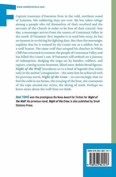 Captain Lourenço d'Ourantes lives in the cold, northern wood of Luiçiana. His soldiering days are over. He has taken refuge among a people who rid themselves of their overlord and the servants of the Church in order to be free of their control. One day, a messenger arrives from the county of Constança Valley in the south. D'Ourantes' first impulse is to send him away, he has no interest in revisiting his fighting days. But then the messenger explains that he is wanted by the Count not as a soldier, but as a wolf hunter. The same wolf that escaped his clutches in White Cliffs has returned to torment the people of Constança Valley and has killed the Count's son. D'Ourantes will embark on a journey of redemption, dodging the traps set by bandits, robbers, and rapists, coming across boatmen, blind seers, Robin Hood figures. Night of the Wolf introduces us to a land of legends that exists only in the author's imagination - the same feat he achieved with his previous novel, Night of the Crow - so convincingly that we feel the cold in our bones, the swaying of the boat, the coarseness of the rope around our wrists, the slicing of teeth. Perhaps we know more about the wolf than we think. Abel Tomé won the prestigious Illa Nova Award for Fiction for Night of the Wolf. His previous novel, Night of the Crow, is also published by Small Stations Press.