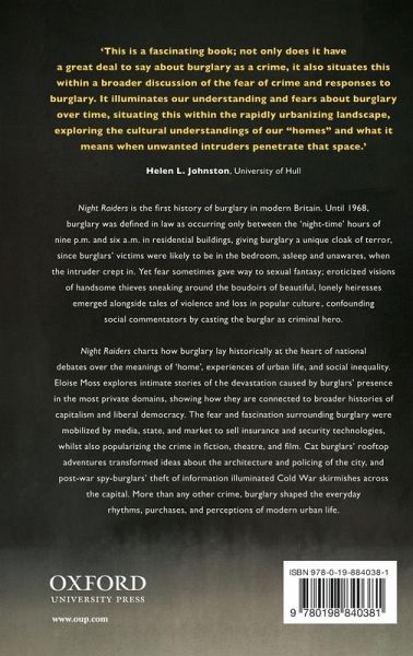 Night Raiders is the first history of burglary in modern Britain. Until 1968, burglary was defined in law as occurring only between the 'night-time' hours of nine pm and six am in residential buildings. Time and space gave burglary a unique cloak of terror, since burglars' victims were likely to be in the bedroom, asleep and unawares, when the intruder crept in, prowling near them in the darkness. Yet fear sometimes gave way to sexual fantasy; eroticized visions of handsome young thieves sneaking around the boudoirs of beautiful, lonely heiresses emerged alongside tales of violence and loss in popular culture, confounding social commentators by casting the burglar as criminal hero. Night Raiders charts how burglary lay historically at the heart of national debates over the meanings of 'home', experiences of urban life, and social inequality. The book explores intimate stories of the devastation caused by burglars' presence in the most private domains, showing how they are deeply embedded within broader histories of capitalism and liberal democracy. The fear and fascination surrounding burglary were mobilized by media, state, and market to sell insurance and security technologies, whilst also popularising the crime in fiction, theatre, and film. Cat burglars' rooftop adventures transformed ideas about the architecture and policing of the city, and post-war 'spy-burglars' theft of information illuminated Cold War skirmishes across the capital. More than any other crime, burglary shaped the everyday rhythms, purchases, and perceptions of modern urban life.
