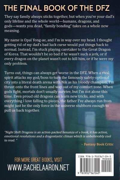 They say family always sticks together, but when you're your dad's only lifeline and the whole world-humans, dragons, and gods-wants you dead, "family bonding" takes on a whole new meaning. My name is Opal Yong-ae, and I'm in way over my head. I thought getting rid of my dad's bad luck curse would put things back to normal. Instead, I'm stuck playing caretaker to the Great Dragon of Korea. That wouldn't be so bad if he wasn't such a jerk, or if every dragon on the planet wasn't out to kill him, or if he were my only problem. Turns out, things can always get worse in the DFZ. When a rival spirit attacks my god/boss looking to turn the famously safety-optional city into a literal death arena with Nik as his bloody champion, I'm thrust onto the front lines and way out of my comfort zone. When gods fight, mortals don't usually survive, but I'm not alone this time. Even proud old dragons can learn new tricks, and with everything I love falling to pieces, the father I've always run from might just be the only force in the universe stubborn enough to pull us back together.