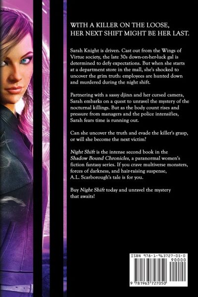 With a killer on the loose, her next shift might be her last. Sarah Knight is driven. Cast out from the Wings of Virtue society, the late 30s down-on-her-luck gal is determined to defy expectations. But when she starts at a department store in the mall, she's shocked to uncover the grim truth: employees are hunted down and murdered during the night shift. Partnering with a sassy djinn and her cursed camera, Sarah embarks on a quest to unravel the mystery of the nocturnal killings. But as the body count rises and pressure from managers and the police intensifies, Sarah fears time is running out. Can she uncover the truth and evade the killer's grasp, or will she become the next victim? Night Shift is the intense second book in the Shadow Bound Chronicles, a paranormal women's fiction fantasy series. If you crave multiverse monsters, forces of darkness, and hair-raising suspense, A.L. Scarborough's tale is for you. Buy Night Shift today and unravel the mystery that awaits!