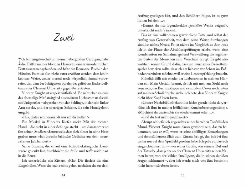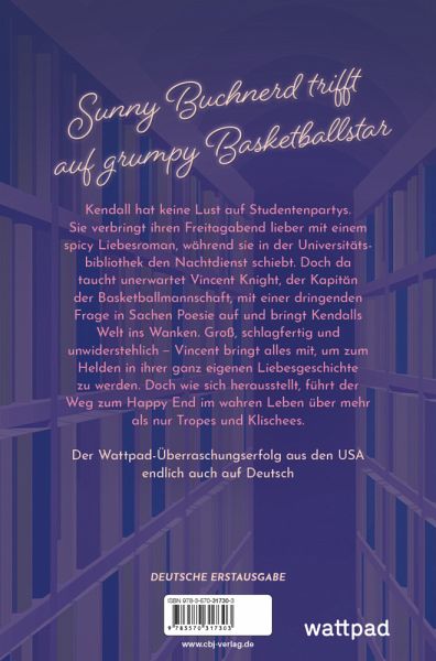Kendall hat keine Lust auf Studentenpartys. Sie verbringt ihren Freitagabend lieber mit einem spicy Liebesroman, während sie in der Universitätsbibliothek den Nachtdienst schmeißt. Doch als unerwartet Vincent Knight, der Kapitän der Basketballmannschaft und wandelnder Herzschmerzmagnet, mit verletztem Handgelenk, schlechter Laune und einer dringenden Frage in Sachen Poesie auftaucht, gerät ihre Welt ins Wanken. Groß, schlagfertig und unwiderstehlich - Vincent bringt alles mit, um zum Helden in Kendalls ganz eigener Liebesgeschichte zu werden. Doch wie sich herausstellt führt der Weg zum Happy End im wahren Leben über mehr als nur Tropes und Klischees.