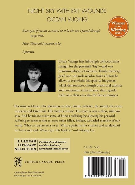 Ocean Vuong: Born in Saigon, Vietnam, Ocean Vuong attended Brooklyn College. He is the author of two chapbooks as well as a full-length collection, Night Sky with Exit Wounds. A 2014 Ruth Lilly Fellow and winner of the 2016 Whiting Award, Ocean Vuong lives in New York City.