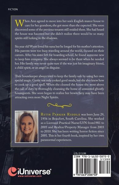 When Ann agreed to move into her son's English manor house to care for her grandson, she got more than she expected. She soon discovered some of the previous tenants still resided there. She had heard the house was haunted but she didn't realize there would be so many spirits still lurking in the shadows. Six year old Wyatt loved his nana but he longed for his mother's attention. His parents were too busy traveling around the world, focused on their careers. After his sister left for boarding school, he found someone new to keep him company. She always seemed to be there when he needed her. His family was never quite sure if she was just his imaginary friend, a child spirit, or an angel in disguise. Their housekeeper always tried to keep the family safe by using her own special magic. Gertie not only cooked good meals, but she also knew how to cook up a good spell. When she cleaned the house she went above the call of duty by thoroughly cleansing the home of unwanted ghostly houseguests. She soon began to realize her bewitchery may have been attracting even more Night Spirits.