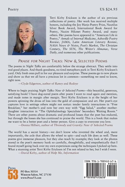 Terri Kirby Erickson is the author of six previous collections of poetry. Her work has received multiple honors, including the Joy Harjo Poetry Prize, Nautilus Silver Book Award, Atlanta Review International Publication Award, International Book Award for Poetry, Gold Medal in the Next Generation Indie Book Awards, Nazim Hikmet Poetry Award, and many others. Her poems have appeared in "American Life in Poetry," Annals of Internal Medicine, Asheville Poetry Review, JAMA, Latin American Literary Review, NASA News & Notes, Poet's Market, Sport Literate, The Christian Century, The SUN, The Writer's Almanac, Verse Daily, and numerous other literary journals, anthologies, newspapers, and magazines. She lives with her husband in North Carolina.