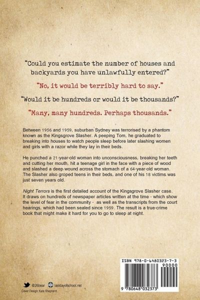 "Could you estimate the number of houses and backyards you have unlawfully entered?" "No, it would be terribly hard to say." "Would it be hundreds or would it be thousands?" "Many, many hundreds. Perhaps thousands." - The Kingsgrove Slasher's police questioning Between 1956 and 1959, suburban Sydney was terrorised by a phantom known as the Kingsgrove Slasher. A peeping Tom, he graduated to breaking into houses to watch people sleep before later slashing women and girls with a razor while they lay in their beds. He punched a 21-year-old woman into unconsciousness, breaking her teeth and cutting her mouth, hit a teenage girl in the face with a piece of wood and slashed a deep wound across the stomach of a 64-year-old woman. The Slasher also groped teens in their beds, and one of his 18 victims was just seven years old. Night Terrors is the first detailed account of the Kingsgrove Slasher case. It draws on hundreds of newspaper articles written at the time - which show the level of fear in the community - as well as the transcripts from the court hearings, which had been sealed since 1959. The result is a true-crime book that might make it hard for you to go to sleep at night.