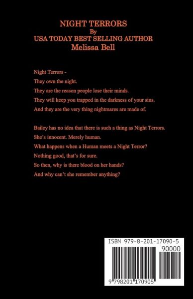 Paranormal Romance Novella. Originally released as part of the Romancing the Shifters Limited Edition Anthology. Night Terrors - They own the night. They are the reason people lose their minds. They will keep you trapped in the darkness of your sins. And they are the very thing nightmares are made of. Bailey has no idea that there is such a thing as Night Terrors. She's innocent. Merely human. What happens when a Human meets a Night Terror? Nothing good, that's for sure. So then why is there blood on her hands? And why can't she remember anything? *Reviewer Comment* Robyn C... Night Terrors by Melissa Bell I was hooked from the very beginning by the great characters and storyline, it intrigued me and needed to know more. I loved Bailey, the female lead character, she was so straightforward and honest. Quintin, the male lead character, was so caring... enough said about him... you have to read it yourself. This short story is filled with terrific expressions that often had me chuckling out loud. I truly hope this story is expanded later as it has the potential for even more, my mind has conjured up all sorts of things!