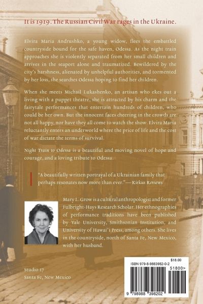 Elvira Maria Andrushko, a young widow, flees the embattled countryside bound for the safe haven, Odessa. As the night train approaches she is violently separated from her small children and arrives in the seaport alone and traumatized. Bewildered by the city's harshness, alienated by unhelpful authorities, and tormented by her loss, she searches Odessa hoping to find her children. When she meets Michail Lukashenko, an artisan who ekes out a living with a puppet theatre, she is attracted by his charm and the fairytale performances that entertain hundreds of children, who could be her own. But the innocent faces cheering in the crowds are not all happy, nor have they all come to watch the show. Elvira Maria reluctantly enters an underworld where the price of life and the cost of war dictate the terms of survival. Night Train to Odessa is a beautiful and moving novel of hope and courage, and a loving tribute to Odessa.