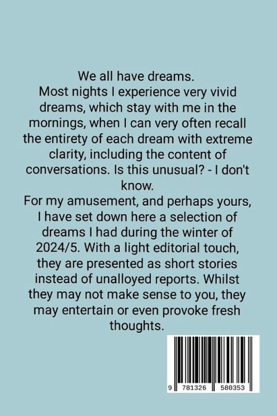 We all have dreams. Most nights I experience very vivid dreams that stay with me in the morning, when I can very often recall the entirety of each dream with extreme clarity, including conversations held. Is this unusual? - I don't know. However, for my amusement and perhaps yours, I have set down here a selection of dreams that I had during the winter of 2024/5. They are written as I remember them and not as a wholly fictionalised experience, although I have added a line here or a word there in order to present them as rounded short stories rather than reported accounts with truncated endings. I do not claim each 'story' will make sense to you. After all, they are my dreams, not yours, and I have yet to decipher them. But they may entertain or even provoke fresh thoughts.