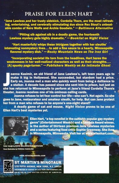 Ellen Hart was named the 2017 MWA Grand Master, the most distinguished lifetime achievement award offered in the mystery community. Joanna Kasimir, an old friend of Jane Lawless's, left town years ago to make it big in Hollywood. She succeeded, but stardom had a price. Early on, Joanna met a man who quickly went from being a dalliance to a stalker. A decade has passed since she sent him to prison, but just as she has returned to Minneapolis to perform at Jane's friend Cordelia Thorn's theater, Joanna receives one of his ominous calling cards. Joanna refuses to let fear control her life---she can't. Not again. So she goes to Jane, restauranteur and amateur sleuth, for help. But can Jane protect her from a man who refuses to be anyone's one-night stand? A deadly game of cat and mouse, Night Vision proves to be one of Ellen Hart's best mysteries yet.