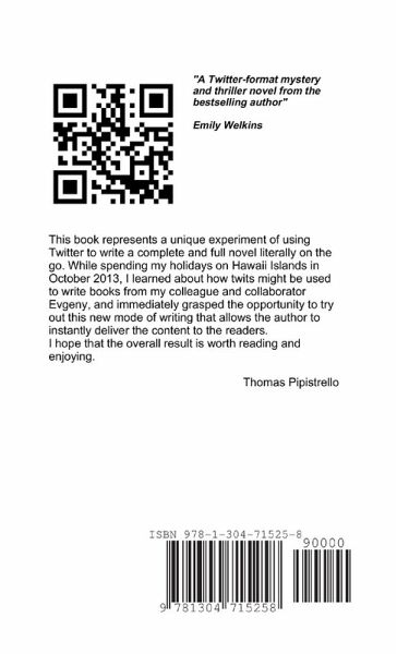 This book represents a unique experiment of using Twitter to write a complete and full novel literally on the go. While spending my holidays on Hawaii Islands in October 2013, I learned about how twits might be used to write books from my colleague and collaborator Evgeny, and immideately grasped the opportunity to try out this new mode of writing that allows the author to instantly deliver the content to the readers. I hope that the overall result is worth reading and enjoying.