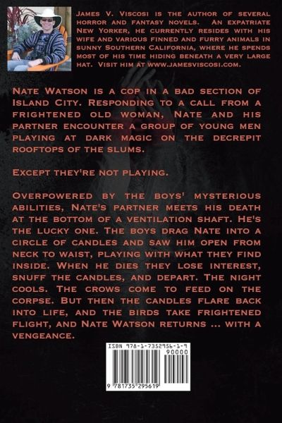 Nate Watson is a cop in a bad section of Island City. Responding to a call from a frightened old woman, Nate and his partner encounter a group of young men playing at dark magic on the decrepit rooftops of the slums. Except they're not playing. Overpowered by the boys' mysterious abilities, Nate's partner meets his death at the bottom of a ventilation shaft. He's the lucky one. The boys drag Nate into a circle of candles and saw him open from neck to waist, playing with what they find inside. When he dies they lose interest, snuff the candles, and depart. The night cools. The crows come to feed on the corpse. But then the candles flare back into life, and the birds take frightened flight, and Nate Watson returns ... with a vengeance.