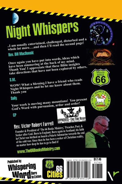 Unusual, fresh and challenging, these essential Daily Bible Insights rarely whisper, but shout! At last, the Christian world has a relevant and up-to-date, honest daily book of Bible insights that speaks to this generation! 'Night-Whispers' have long since been a global endeavour to communicate the God of the whole Bible in very raw terms to very real people. They are presented in such a way as to be read each day and are produced on a regular basis, the 366 daily readings for each year being presented with a unique volume number. That 'Volume' year is then divided into four Quarters. You can start any volume-quarter book of Night Whispers at any time you choose, because whilst these Everyday Bible Insights are fresh and relevant to each day, they are not interconnected in a way which means you have to read one volume before another. They are Biblical, fresh, provocative, relevant, and always challenging and always powerful. Night-Whispers: get yours today