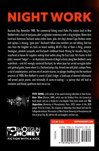 Buzzards Bay. November 1980. The commercial fishing vessel Padre Pio motors back to New Bedford with a haul of marijuana after a nighttime rendezvous with a drug freighter. Below deck hard-luck fisherman Duchand wakes before dawn. João, the ship's devout Cape Verdean owner and captain, is missing, "gone over." Duchand's fellow crew members are not talking. And two men from the freighter are back on board wielding AK-47s. One of them is Berg, amateur theologian, absolute sociopath, and Duchand's childhood friend. Missing for decades, Berg has resurfaced as liaison for suppliers seeking retail outlets along the East Coast. He's frantic to find João's rumored "ledger"- an illustrated chronicle of illegal activity along New Bedford's seedy waterfront-and he's wrongly convinced Duchand, for whom Joao has served surrogate father and spiritual guide, knows where it is. Duchand jumps ship. Armed now with João's antique 9mm, a vial of amphetamines, and two sets of ancient rosaries, he plunges headlong into the moribund precincts of 1980s New Bedford in search of João's ledger, a landscape of doomed informants, well-armed parish priests, and terminally ill saints-in-waiting-a journey that will lead to revelation and bloody apotheosis back out at sea. What folks are saying... "Part crime novel, part theological investigation, Pete Duval's brilliant and riveting Night Work reads like some lost Melville story, dug out of an attic trunk and updated for the seedy harbors of New England in the 1980s. Both a haunting and an act of grace, this is a novel of incredible power." -Mark Powell, author of Hurricane Season and The Late Rebellion "Night Work is a speed-fueled fever dream of a novel, a breakneck thriller with the soul of a gothic ghost tale. Told in exuberant prose, it is a story that will haunt you long after you've read its final pages." -C. Matthew Smith, author of Twentymile "Pete Duval stretches reality like a rubber band. And never lets it break. Night Work is a fascinating work that finds a home somewhere between the mirages of Heart of Darkness and the illusions of Angel Heart. It's beautifully written, haunting, poetic, with all senses tingling. It's also an edge-of-your-seat thriller with a main character that taunts the reader with his closeness and yet remains a teasing 'other'. A strange book unlike anything current crime literature has to offer. A true gift." -M.E. Proctor, author of Love You Till Tuesday "Night Work is a contemplative thriller that leads the reader to the haunted edge along with its lead character Duchand. Pete Duval crafts an unrelenting story through a landscape of dark choices that will leave you with lingering ghosts." -Rob D. Smith, author of Good-looking Ugly