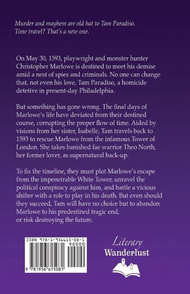 Murder and mayhem are old hat to Tam Paradiso. Time travel? That's a new one. On May 30, 1593, playwright and monster hunter Christopher Marlowe is destined to meet his demise amid a nest of spies and criminals. No one can change that, not even his love, Tam Paradiso, a homicide detective in present-day Philadelphia. But something has gone wrong. The final days of Marlowe's life have deviated from their destined course, corrupting the proper flow of time. Aided by visions from her sister, Isabelle, Tam travels back to 1593 to rescue Marlowe from the infamous Tower of London. She takes banished fae warrior Theo North, her former lover, as supernatural back-up. To fix the timeline, they must plot Marlowe's escape from the impenetrable White Tower, unravel the political conspiracy against him, and battle a vicious shifter with a role to play in his death. But even should they succeed, Tam will have no choice but to abandon Marlowe to his predestined tragic end, or risk destroying the future.