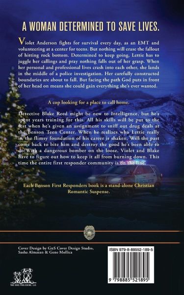 BIG CITY CRIME. SMALL TOWN HEROES A woman determined to save lives. Violet Anderson fights for survival every day, as an EMT and volunteering at a center for teens. But nothing will erase the fallout of hitting rock bottom. Determined to keep going, Lettie has to juggle her callings and pray nothing falls out of her grasp. When her personal and professional lives crash into each other, she lands in the middle of a police investigation. Her carefully constructed boundaries are about to fall. But facing the path God puts in front of her head on means she could gain everything she's ever wanted. A cop looking for a place to call home. Detective Blake Reed might be new to Intelligence, but he's spent years training for this. All his skills will be put to the test when he's given an assignment to sniff out drug deals at the Benson Teen Center. When he realizes who Lettie really is, the flimsy foundation of his career is shaken. Will the past come back to bite him and destroy the good he's been able to do? With a dangerous bomber on the loose, Violet and Blake have to figure out how to keep it all from burning down. This time the entire first responder community is on the line. Each Benson First Responders story is a stand-alone Christian romantic suspense.