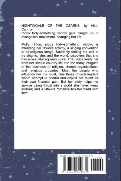 Molly Hilton, pious forty-something widow, is attending her favorite activity, a singing convention of all-religious songs. Suddenly feeling the call to try singing, she, and the world, discovers that she has a beautiful soprano voice. That voice leads her from her simple country life into the many intrigues of the business of religion, church organizations, and religious crusades. Meet the people who influence her the most, plus those church leaders whom attempt to control and exploit her talent for their own financial gain. But her piety helps her survive being thrust into a world she never knew existed; and a late-life romance fills her heart with love.