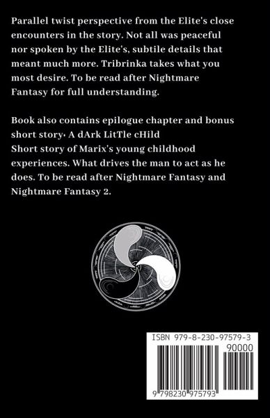 Parallel twist perspective from the Elite's close encounters in the story. Not all was peaceful nor spoken by the Elite's. Tribrinka takes what you most desire. To be read after Nightmare Fantasy. DISCLAIMER: DOES HAVE THEMES OF PSYCHOLOGICAL ABUSE AND RAPE LACED IN PLACES ALL THROUGHOUT STORY. Book also contains epilogue chapter and bonus short story: A dArk LitTle cHild Short story of Marix's young childhood experiences. What drives the man to act as he does. To be read after Nightmare Fantasy and Nightmare Fantasy 2.