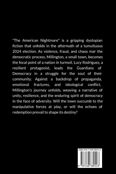 "The American Nightmare" is a gripping dystopian fiction that unfolds in the aftermath of a tumultuous 2024 election. As violence, fraud, and chaos mar the democratic process, Millington, a small town, becomes the focal point of a nation in turmoil. Lucy Rodriguez, a resilient protagonist, leads the Guardians of Democracy in a struggle for the soul of their community. Against a backdrop of propaganda, emotional fractures, and ideological conflict, Millington's journey unfolds, weaving a narrative of unity, resilience, and the enduring spirit of democracy in the face of adversity. Will the town succumb to the manipulative forces at play, or will the echoes of redemption prevail to shape its destiny?