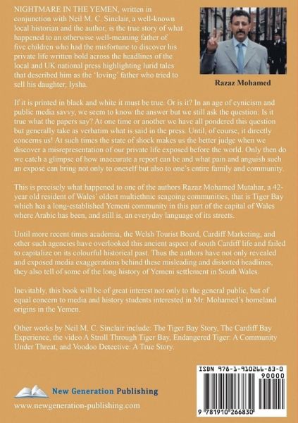 The author is donating his royalties from this book to the Sheba Organisation. NIGHTMARE IN THE YEMEN, written in conjunction with Neil M. C. Sinclair, a well-known local historian and the author, is the true story of what happened to an otherwise well-meaning father of five children who had the misfortune to discover his private life written bold across the headlines of the local and UK national press highlighting lurid tales that described him as the 'loving' father who tried to sell his daughter, Iysha. If it is printed in black and white it must be true. Or is it? In an age of cynicism and public media savvy, we seem to know the answer but we still ask the question: Is it true what the papers say? At one time or another we have all pondered this question but generally take as verbatim what is said in the press. Until, of course, it directly concerns us! At such times the state of shock makes us the better judge when we discover a misrepresentation of our private life exposed before the world. Only then do we catch a glimpse of how inaccurate a report can be and what pain and anguish such an exposé can bring not only to oneself but also to one's entire family and community. This is precisely what happened to one of the authors Razaz Mohamed Mutahar, a 42-year old resident of Wales' oldest multiethnic seagoing communities, that is Tiger Bay which has a long-established Yemeni community in this part of the capital of Wales where Arabic has been, and still is, an everyday language of its streets. Until more recent times academia, the Welsh Tourist Board, Cardiff Marketing, and other such agencies have overlooked this ancient aspect of south Cardiff life and failed to capitalize on its colourful historical past. Thus the authors have not only revealed and exposed media exaggerations behind these misleading and distorted headlines, they also tell of some of the long history of Yemeni settlement in South Wales. Inevitably, this book will be of great interest not only to the general public, but of equal concern to media and history students interested in Mr. Mohamed's homeland origins in the Yemen. Other works by Neil M. C. Sinclair include: The Tiger Bay Story, The Cardiff Bay Experience, the video A Stroll Through Tiger Bay, Endangered Tiger: A Community Under Threat, and Voodoo Detective: A True Story.