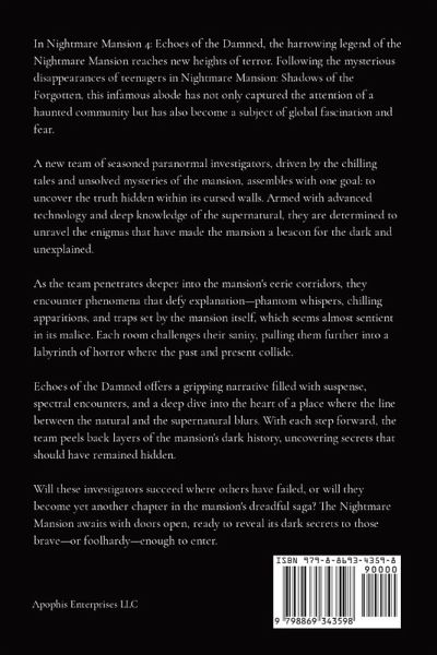 In Nightmare Mansion 4: Echoes of the Damned, the harrowing legend of the Nightmare Mansion reaches new heights of terror. Following the mysterious disappearances of teenagers in Nightmare Mansion: Shadows of the Forgotten, this infamous abode has not only captured the attention of a haunted community but has also become a subject of global fascination and fear. A new team of seasoned paranormal investigators, driven by the chilling tales and unsolved mysteries of the mansion, assembles with one goal: to uncover the truth hidden within its cursed walls. Armed with advanced technology and deep knowledge of the supernatural, they are determined to unravel the enigmas that have made the mansion a beacon for the dark and unexplained. As the team penetrates deeper into the mansion's eerie corridors, they encounter phenomena that defy explanation-phantom whispers, chilling apparitions, and traps set by the mansion itself, which seems almost sentient in its malice. Each room challenges their sanity, pulling them further into a labyrinth of horror where the past and present collide. Echoes of the Damned offers a gripping narrative filled with suspense, spectral encounters, and a deep dive into the heart of a place where the line between the natural and the supernatural blurs. With each step forward, the team peels back layers of the mansion's dark history, uncovering secrets that should have remained hidden. Will these investigators succeed where others have failed, or will they become yet another chapter in the mansion's dreadful saga? The Nightmare Mansion awaits with doors open, ready to reveal its dark secrets to those brave-or foolhardy-enough to enter.
