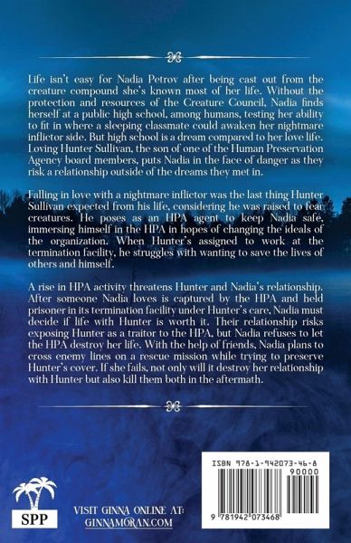 She's his ultimate dream girl. Life isn't easy for Nadia Petrov after being cast out from the creature compound she's known most of her life. Without the protection and resources of the Creature Council, Nadia finds herself at a public high school, among humans, testing her ability to fit in where a sleeping classmate could awaken her nightmare inflictor side. But high school is a dream compared to her love life. Loving Hunter Sullivan, the son of one of the Human Preservation Agency board members, puts Nadia in the face of danger as they risk a relationship outside of the dreams they met in. Falling in love with a nightmare inflictor was the last thing Hunter Sullivan expected from his life, considering he was raised to fear creatures. He poses as an HPA agent to keep Nadia safe, immersing himself in the HPA in hopes of changing the ideals of the organization. When Hunter's assigned to work at the termination facility, he struggles with wanting to save the lives of others and himself. A rise in HPA activity threatens Hunter and Nadia's relationship. After someone Nadia loves is captured by the HPA and held prisoner in its termination facility under Hunter's care, Nadia must decide if life with Hunter is worth it. Their relationship risks exposing Hunter as a traitor to the HPA, but Nadia refuses to let the HPA destroy her life. With the help of friends, Nadia plans to cross enemy lines on a rescue mission while trying to preserve Hunter's cover. If she fails, not only will it destroy her relationship with Hunter but also kill them both in the aftermath.
