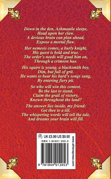 Down in the den, Ashmantle sleeps, Head upon her claw. A devious brain can plan ahead, Expose a mortal flaw. Her nemesis comes, a burly knight, His quest is bold and true. The order's needs will goad him on, Through a crimson hue. His squire is young, a blacksmith boy, Dim, but full of grit. He wants to hear his bard's songs sung, By entering fiery pit. So who will win this contest, Be the last to stand, Claim the grail of victory, Known throughout the land? The answer lies inside, my friend: Get thee to a till. The whispering words will tell the tale, And dreams your brain will fill.