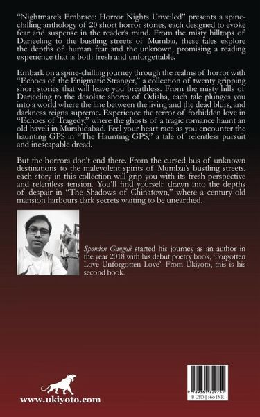 "Nightmare's Embrace: Horror Nights Unveiled" presents a spine- chilling anthology of 20 short horror stories, each designed to evoke fear and suspense in the reader's mind. From the misty hilltops of Darjeeling to the bustling streets of Mumbai, these tales explore the depths of human fear and the unknown, promising a reading experience that is both fresh and unforgettable. Embark on a spine-chilling journey through the realms of horror with "Echoes of the Enigmatic Stranger," a collection of twenty gripping short stories that will leave you breathless. From the misty hills of Darjeeling to the desolate shores of Odisha, each tale plunges you into a world where the line between the living and the dead blurs, and darkness reigns supreme. Experience the terror of forbidden love in "Echoes of Tragedy," where the ghosts of a tragic romance haunt an old haveli in Murshidabad. Feel your heart race as you encounter the haunting GPS in "The Haunting GPS," a tale of relentless pursuit and inescapable dread. But the horrors don't end there. From the cursed bus of unknown destinations to the malevolent spirits of Mumbai's bustling streets, each story in this collection will grip you with its fresh perspective and relentless tension. You'll find yourself drawn into the depths of despair in "The Shadows of Chinatown," where a century-old mansion harbours dark secrets waiting to be unearthed.