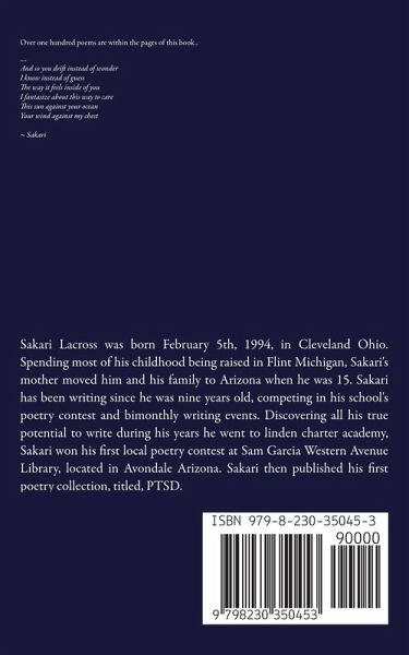 Sakari Lacross was born February 5th, 1994, in Cleveland Ohio. Spending most of his childhood being raised in Flint Michigan, Sakari's mother moved him and his family to Arizona when he was 15. Sakari has been writing since he was nine years old, competing in his school's poetry contest and bimonthly writing events. Discovering all his true potential to write during his years he went to linden charter academy, Sakari won his first local poetry contest at Sam Garcia Western Avenue Library, located in Avondale Arizona. Sakari then published his first poetry collection, titled, PTSD.
