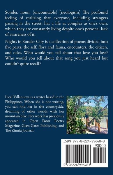 Sonder. noun. (uncountable) (neologism) The profound feeling of realizing that everyone, including strangers passing in the street, has a life as complex as one's own, which they are constantly living despite one's personal lack of awareness of it. Nights in Sonder City is a collection of poems divided into five parts: the self, flora and fauna, encounters, the citizen, and odes. Who would you tell about that love you lost? Who would you tell about that song you just heard but couldn't quite recall?