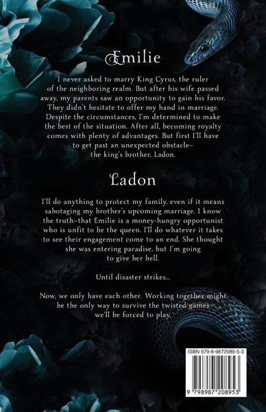 Emilie I never asked to marry King Cyrus, the ruler of the neighboring realm. But after his wife passed away, my parents saw an opportunity to gain his favor. They didn't hesitate to offer my hand in marriage. Despite the circumstances, I'm determined to make the best of the situation. After all, becoming royalty comes with plenty of advantages. But first I'll have to get past an unexpected obstacle-the king's brother, Ladon. Ladon I'll do anything to protect my family, even if it means sabotaging my brother's upcoming marriage. I know the truth-that Emilie is a money-hungry opportunist who is unfit to be the queen. I'll do whatever it takes to see their engagement come to an end. She thought she was entering paradise, but I'm going to give her hell. Until disaster strikes... Now, we only have each other. Working together might be the only way to survive the twisted games we'll be forced to play.