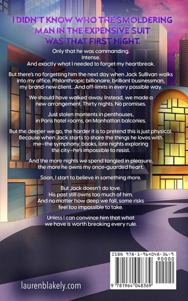 I didn't know who the smoldering man in the expensive suit was that first night. Only that he was commanding. Intense. And exactly what I needed to forget my heartbreak. But there's no forgetting him the next day when Jack Sullivan walks into my office. Philanthropic billionaire, brilliant businessman, my brand-new client... And off-limits in every possible way. We should have walked away. Instead, we made a new arrangement. Thirty nights. No promises. Just stolen moments in penthouses, in Paris hotel rooms, on Manhattan balconies. But the deeper we go, the harder it is to pretend this is just physical. Because when Jack starts to share the things he loves with me-the symphony, books, late nights exploring the city-he's impossible to resist. And the more nights we spend tangled in pleasure, the more he owns my once-guarded heart. Soon, I start to believe in something more. But Jack doesn't do love. His past still owns too much of him. And no matter how deep we fall, some risks feel too impossible to take. Unless I can convince him that what we have is worth breaking every rule.