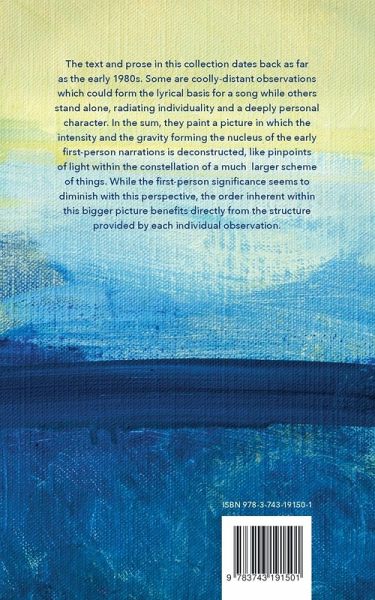 The text and prose contained in this collection dates back as far as the early 1980s. Some are coolly-distant observations which could form the lyrical basis for a song while others stand alone, radiating individuality and a deeply personal character. In sum, they paint a picture in which the intensity and the gravity forming the nucleus of the early first-person narrations is deconstructed, like pinpoints of light within the constellation of a much larger scheme of things. While the first-person significance seems to diminish with this perspective, the order inherent within this bigger picture benefits directly from the structure provided by each individual observation.