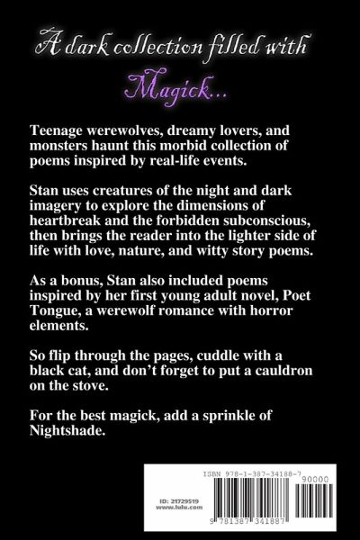 Teenage werewolves, dreamy lovers, and monsters haunt this morbid collection of poems inspired by real-life events. Stan uses creatures of the night and dark imagery to explore the dimensions of heartbreak and the forbidden subconscious, then brings the reader into the lighter side of life with love, nature, and witty story poems. As a bonus, Stan also included poems inspired by her first young adult novel, Poet Tongue, a werewolf romance with horror elements. So flip through the pages, cuddle with a black cat, and don't forget to put a cauldron on the stove. For the best magick, add a sprinkle of Nightshade. Poetry sections include topics on: 1) Heartbreak 2) Love 3) The Mind 4) Nature 5) Story Poems 6) Poems Inspired by Poet Tongue, Stan's first young adult werewolf novel