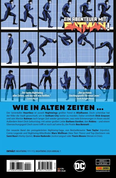 WIE IN ALTEN ZEITEN... Der Serienkiller Heartless ist zurzeit Nightwings größter Feind in Blüdhaven. Doch scheinbar hat der Killer die Stadt gewechselt, um in Gotham City weiter zu morden. Daher ermitteln Dick Grayson und sein Mentor Batman nach langer Zeit mal wieder gemeinsam, was viele Erinnerungen in ihnen weckt! Außerdem feiert Dick Geburtstag: mit seiner großen Liebe Barbara Gordon, den Robins - und einem Überraschungsgast! Doch zuvor trifft er noch auf seine Ex, die Piratin Bea Bennett... Der neueste Band der preisgekrönten Nightwing-Saga, von Bestsellerautor Tom Taylor (Injustice), Comic-Legende und Nightwing-Miterfinder Marv Wolfman (New Teen Titans) und Top-Zeichnern wie Sam Basri (Harley Quinn), Bruno Redondo (Justice League) oder Travis Moore (Heroes in Crisis).ENTHÄLT: NIGHTWING 111-113, NIGHTWING 2024 ANNUAL 1