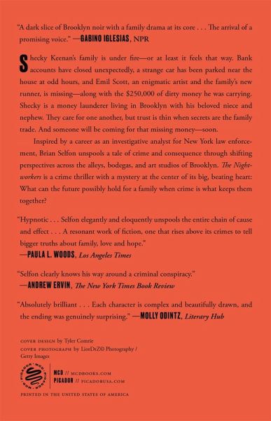 "Electric, surprising, and tightly plotted . . . A compelling writer to watch." -Adrienne Westenfeld, Esquire "A gripping, big-hearted thriller . . . whip-smart and surprisingly funny." -Harlan Coben The Nightworkers is an electrifying debut crime novel from Brian Selfon about a Brooklyn family of money launderers thrown into chaos when a runner ends up dead and a bag of dirty money goes missing. Shecky Keenan's family is under fire-or at least it feels that way. Bank accounts have closed unexpectedly, a strange car has been parked near the house at odd hours, and Emil Scott, an enigmatic artist and the family's new runner, is missing-along with the $250,000 of dirty money he was carrying. Shecky lives in old Brooklyn with his niece Kerasha and nephew Henry, and while his deepest desire is to keep his little makeshift family safe, that doesn't stop him from taking advantage of their talents. Shecky moves money for an array of unsavory clients, and Henry, volatile and violent but tenderhearted, is his bagman. Kerasha, the famed former child-thief of Bushwick, is still learning the family trade, but her quick mind and quicker fingers are already being put to use. They love one another, but trust is thin when secrets are the family trade. And someone will be coming for that missing money-soon. Inspired by a career that has included corruption cases and wiretaps as an investigative analyst for New York law enforcement, Brian Selfon unspools a tale of crime and consequence through shifting perspectives across the streets, alleys, bodegas, and art studios of Brooklyn. The Nightworkers is an evocative blend of genres: a literary crime thriller with a mystery at the center of its big beating heart: What really happened to Emil Scott, and what can the future possibly hold for a family when crime is what keeps them together?
