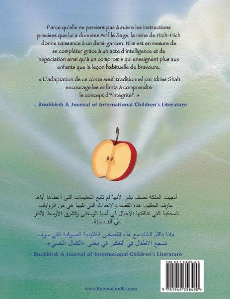 (Edition bilingue français-arabe) Voulant vraiment avoir un fils, la reine de Hich-Hich vient consulter Arif le Sage. Mais faute de suivre ses instructions précises, elle donne naissance à un demi-garçon qu'elle appelle Niim. Que Niim soit capable de compléter sa moitié par un acte d'intelligence, de négociation et de compromis enseigne aux enfants beaucoup plus que l'habituelle leçon de bravoure attendue. Ce conte enchanteur, avec des fées et un dragon cracheur de feu, est merveilleusement et illustré par la magie de Midori Mori et Robert Revels. Niim le demi-garçon fait partie d'une série illustrée d'histoires-enseignement soufies du Moyen-Orient et d'Asie centrale rassemblées et adaptées pour la jeunesse par Idries Shah qui ont captivé les c¿urs et les esprits pendant plus de mille ans. Les histoires sont conçues pour aider les enfants à apprendre à examiner leurs suppositions et à penser par eux-mêmes.