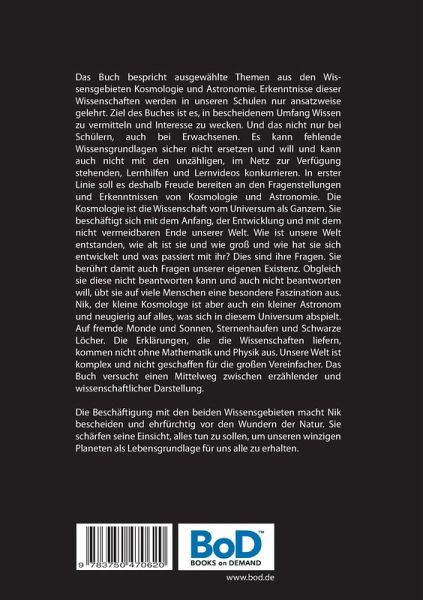 Das Buch bespricht ausgewählte Themen aus den Wissensgebieten Astronomie und Kosmologie. Erkenntnisse dieser Wissenschaften werden in unseren Schulen nur ansatzweise gelehrt. Ziel des Buches ist es deshalb, nicht nur in bescheidenem Umfang Wissen zu vermitteln und Interesse zu wecken. Und das nicht nur bei Schülern, auch bei Erwachsenen. Es kann fehlende Wissensgrundlagen sicher nicht ersetzen und will und kann auch nicht mit den unzähligen im Netz zur Verfügung stehenden Lernhilfen und Lernvideos konkurrieren. In erster Linie soll es deshalb Freude bereiten an den Fragenstellungen der Astronomie und Kosmologie.Die Kosmologie ist die Wissenschaft vom Universum als Ganzem. Sie beschäftigt sich mit dem Anfang, der Entwicklung und mit dem unvermeidbaren Ende unserer Welt. Wie ist unsere Welt entstanden, wie alt ist sie und wie groß und wie hat sie sich entwickelt und was passiert mit ihr? Dies sind ihre Fragen. Sie berührt damit auch Fragen unserer eigenen Existenz. Obgleich sie diese nicht beantworten kann und auch nicht will, übt sie auf viele Menschen eine besondere Faszination aus. Die Erklärungen, die sie liefert kommen nicht ohne mathematische und physikalische Kenntnisse aus. Das Buch versucht dabei einen Mittelweg zwischen oberflächlicher und wissenschaftlicher Darstellung. Die Welt ist nun einmal komplex und nicht geschaffen für die großen Vereinfacher. Nik, der kleine Kosmologe ist aber auch ein kleiner Astronom und neugierig auf alles, was sich in diesem Universum abspielt. Auf fremde Monde und Sonnen, Sternenhaufen und Schwarze Löcher. Die Beschäftigung mit diesen Themen macht ihn bescheiden und ehrfürchtig vor den Wundern der Natur. Sie schärfen seine Einsicht, alles tun zu sollen, um unsere winzigen Planeten als Lebensgrundlage für uns alle zu erhalten.