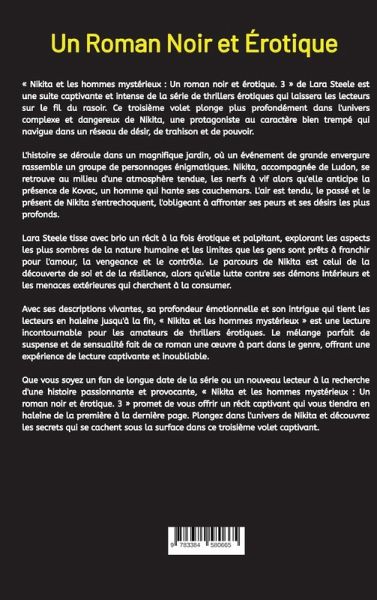 « Nikita et les hommes mystérieux : Un roman noir et érotique. 3 » de Lara Steele est une suite captivante et intense de la série de thrillers érotiques qui laissera les lecteurs sur le fil du rasoir. Ce troisième volet plonge plus profondément dans l'univers complexe et dangereux de Nikita, une protagoniste au caractère bien trempé qui navigue dans un réseau de désir, de trahison et de pouvoir.L'histoire se déroule dans un magnifique jardin, où un événement de grande envergure rassemble un groupe de personnages énigmatiques. Nikita, accompagnée de Ludon, se retrouve au milieu d'une atmosphère tendue, les nerfs à vif alors qu'elle anticipe la présence de Kovac, un homme qui hante ses cauchemars. L'air est tendu, le passé et le présent de Nikita s'entrechoquent, l'obligeant à affronter ses peurs et ses désirs les plus profonds.Lara Steele tisse avec brio un récit à la fois érotique et palpitant, explorant les aspects les plus sombres de la nature humaine et les limites que les gens sont prêts à franchir pour l'amour, la vengeance et le contrôle. Le parcours de Nikita est celui de la découverte de soi et de la résilience, alors qu'elle lutte contre ses démons intérieurs et les menaces extérieures qui cherchent à la consumer.Avec ses descriptions vivantes, sa profondeur émotionnelle et son intrigue qui tient les lecteurs en haleine jusqu'à la fin, « Nikita et les hommes mystérieux » est une lecture incontournable pour les amateurs de thrillers érotiques. Le mélange parfait de suspense et de sensualité fait de ce roman une oeuvre à part dans le genre, offrant une expérience de lecture captivante et inoubliable.Que vous soyez un fan de longue date de la série ou un nouveau lecteur à la recherche d'une histoire passionnante et provocante, « Nikita et les hommes mystérieux : Un roman noir et érotique. 3 » promet de vous offrir un récit captivant qui vous tiendra en haleine de la première à la dernière page. Plongez dans l'univers de Nikita et découvrez les secrets qui se cachent sous la surface dans ce troisième volet captivant.