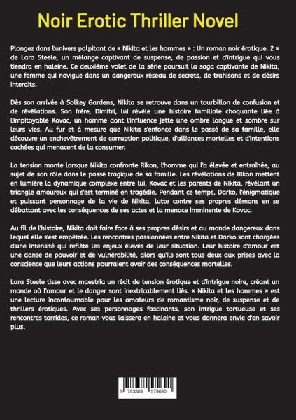 Plongez dans l'univers palpitant de « Nikita et les hommes » : Un roman noir érotique. 2 » de Lara Steele, un mélange captivant de suspense, de passion et d'intrigue qui vous tiendra en haleine. Ce deuxième volet de la série poursuit la saga captivante de Nikita, une femme qui navigue dans un dangereux réseau de secrets, de trahisons et de désirs interdits.Dès son arrivée à Solkey Gardens, Nikita se retrouve dans un tourbillon de confusion et de révélations. Son frère, Dimitri, lui révèle une histoire familiale choquante liée à l'impitoyable Kovac, un homme dont l'influence jette une ombre longue et sombre sur leurs vies. Au fur et à mesure que Nikita s'enfonce dans le passé de sa famille, elle découvre un enchevêtrement de corruption politique, d'alliances mortelles et d'intentions cachées qui menacent de la consumer.La tension monte lorsque Nikita confronte Rikon, l'homme qui l'a élevée et entraînée, au sujet de son rôle dans le passé tragique de sa famille. Les révélations de Rikon mettent en lumière la dynamique complexe entre lui, Kovac et les parents de Nikita, révélant un triangle amoureux qui s'est terminé en tragédie. Pendant ce temps, Darko, l'énigmatique et puissant personnage de la vie de Nikita, lutte contre ses propres démons en se débattant avec les conséquences de ses actes et la menace imminente de Kovac.Au fil de l'histoire, Nikita doit faire face à ses propres désirs et au monde dangereux dans lequel elle s'est empêtrée. Les rencontres passionnées entre Nikita et Darko sont chargées d'une intensité qui reflète les enjeux élevés de leur situation. Leur histoire d'amour est une danse de pouvoir et de vulnérabilité, alors qu'ils sont tous deux aux prises avec la conscience que leurs actions pourraient avoir des conséquences mortelles.Lara Steele tisse avec maestria un récit de tension érotique et d'intrigue noire, créant un monde où l'amour et le danger sont inextricablement liés. « Nikita et les hommes » est une lecture incontournable pour les amateurs de romantisme noir, de suspense et de thrillers érotiques. Avec ses personnages fascinants, son intrigue tortueuse et ses rencontres torrides, ce roman vous laissera en haleine et vous donnera envie d'en savoir plus.