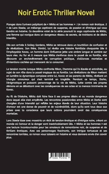Plongez dans l'univers palpitant de « Nikita et les hommes » : Un roman noir érotique. 2 » de Lara Steele, un mélange captivant de suspense, de passion et d'intrigue qui vous tiendra en haleine. Ce deuxième volet de la série poursuit la saga captivante de Nikita, une femme qui navigue dans un dangereux réseau de secrets, de trahisons et de désirs interdits.Dès son arrivée à Solkey Gardens, Nikita se retrouve dans un tourbillon de confusion et de révélations. Son frère, Dimitri, lui révèle une histoire familiale choquante liée à l'impitoyable Kovac, un homme dont l'influence jette une ombre longue et sombre sur leurs vies. Au fur et à mesure que Nikita s'enfonce dans le passé de sa famille, elle découvre un enchevêtrement de corruption politique, d'alliances mortelles et d'intentions cachées qui menacent de la consumer.La tension monte lorsque Nikita confronte Rikon, l'homme qui l'a élevée et entraînée, au sujet de son rôle dans le passé tragique de sa famille. Les révélations de Rikon mettent en lumière la dynamique complexe entre lui, Kovac et les parents de Nikita, révélant un triangle amoureux qui s'est terminé en tragédie. Pendant ce temps, Darko, l'énigmatique et puissant personnage de la vie de Nikita, lutte contre ses propres démons en se débattant avec les conséquences de ses actes et la menace imminente de Kovac.Au fil de l'histoire, Nikita doit faire face à ses propres désirs et au monde dangereux dans lequel elle s'est empêtrée. Les rencontres passionnées entre Nikita et Darko sont chargées d'une intensité qui reflète les enjeux élevés de leur situation. Leur histoire d'amour est une danse de pouvoir et de vulnérabilité, alors qu'ils sont tous deux aux prises avec la conscience que leurs actions pourraient avoir des conséquences mortelles.Lara Steele tisse avec maestria un récit de tension érotique et d'intrigue noire, créant un monde où l'amour et le danger sont inextricablement liés. « Nikita et les hommes » est une lecture incontournable pour les amateurs de romantisme noir, de suspense et de thrillers érotiques. Avec ses personnages fascinants, son intrigue tortueuse et ses rencontres torrides, ce roman vous laissera en haleine et vous donnera envie d'en savoir plus.