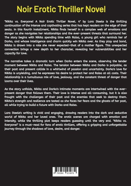 "Nikita vs. Everyone! A Noir Erotic Thriller Novel. 4" by Lara Steele is the thrilling continuation of the intense and captivating series that has kept readers on the edge of their seats. In this fourth installment, Nikita finds herself in a complex web of emotions and danger as she navigates her relationships and the ever-present threats that surround her. The story begins with Nikita spending time with Raisa, a young girl who reminds her of Darko, and whose intelligence and charm quickly win Nikita over. As they play and bond, Nikita is drawn into a role she never expected-that of a mother figure. This unexpected connection brings a new depth to her character, revealing her vulnerabilities and her capacity for love.The narrative takes a dramatic turn when Darko enters the scene, observing the tender moment between Nikita and Raisa. The tension between Nikita and Darko is palpable, as their past and present collide in a whirlwind of passion and uncertainty. Darko's love for Nikita is unyielding, and he expresses his desire to protect her and Raisa at all costs. Their relationship is a tumultuous mix of love, jealousy, and the constant threat of danger that looms over their lives.As the story unfolds, Nikita and Darko's intimate moments are intertwined with the ever-present danger that follows them. Their love is intense and all-consuming, but it is also fraught with the challenges of their past and the enemies that seek to destroy them. Nikita's strength and resilience are tested as she faces her fears and the ghosts of her past, all while trying to build a future with Darko and Raisa.Lara Steele's writing is vivid and engaging, drawing readers into the dark and seductive world of Nikita and her loved ones. The erotic scenes are charged with emotion and intensity, while the thrilling plot keeps readers guessing until the very end. "Nikita vs. Everyone!" is a must-read for fans of erotic thrillers, offering a gripping and unforgettable journey through theshadows of love, desire, and danger.