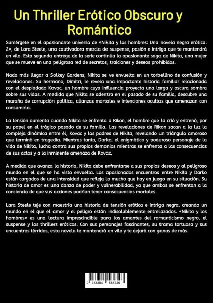 Sumérgete en el apasionante universo de «Nikita y los hombres: Una novela negra erótica. 2», de Lara Steele, una cautivadora mezcla de suspense, pasión e intriga que te mantendrá en vilo. Esta segunda entrega de la serie continúa la apasionante saga de Nikita, una mujer que se mueve en una peligrosa red de secretos, traiciones y deseos prohibidos.Nada más llegar a Solkey Gardens, Nikita se ve envuelta en un torbellino de confusión y revelaciones. Su hermano, Dimitri, le revela una impactante historia familiar relacionada con el despiadado Kovac, un hombre cuya influencia proyecta una larga y oscura sombra sobre sus vidas. A medida que Nikita se adentra en el pasado de su familia, descubre una maraña de corrupción política, alianzas mortales e intenciones ocultas que amenazan con consumirla.La tensión aumenta cuando Nikita se enfrenta a Rikon, el hombre que la crió y entrenó, por su papel en el trágico pasado de su familia. Las revelaciones de Rikon sacan a la luz la compleja dinámica entre él, Kovac y los padres de Nikita, revelando un triángulo amoroso que terminó en tragedia. Mientras tanto, Darko, el enigmático y poderoso personaje de la vida de Nikita, lucha contra sus propios demonios mientras se enfrenta a las consecuencias de sus actos y a la inminente amenaza de Kovac.A medida que avanza la historia, Nikita debe enfrentarse a sus propios deseos y al peligroso mundo en el que se ha visto envuelta. Los apasionados encuentros entre Nikita y Darko están cargados de una intensidad que refleja lo mucho que hay en juego en su situación. Su historia de amor es una danza de poder y vulnerabilidad, ya que ambos se enfrentan a la conciencia de que sus acciones podrían tener consecuencias mortales.Lara Steele teje con maestría una historia de tensión erótica e intriga negra, creando un mundo en el que el amor y el peligro están indisolublemente entrelazados. «Nikita y los hombres» es una lectura imprescindible para los amantes del romanticismo negro, el suspense y los thrillers eróticos. Con sus personajes fascinantes, su trama tortuosa y sus encuentros tórridos, esta novela te mantendrá en vilo y te dejará con ganas de más.