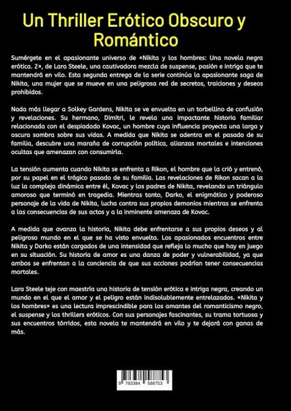 Sumérgete en el apasionante universo de «Nikita y los hombres: Una novela negra erótica. 2», de Lara Steele, una cautivadora mezcla de suspense, pasión e intriga que te mantendrá en vilo. Esta segunda entrega de la serie continúa la apasionante saga de Nikita, una mujer que se mueve en una peligrosa red de secretos, traiciones y deseos prohibidos.Nada más llegar a Solkey Gardens, Nikita se ve envuelta en un torbellino de confusión y revelaciones. Su hermano, Dimitri, le revela una impactante historia familiar relacionada con el despiadado Kovac, un hombre cuya influencia proyecta una larga y oscura sombra sobre sus vidas. A medida que Nikita se adentra en el pasado de su familia, descubre una maraña de corrupción política, alianzas mortales e intenciones ocultas que amenazan con consumirla.La tensión aumenta cuando Nikita se enfrenta a Rikon, el hombre que la crió y entrenó, por su papel en el trágico pasado de su familia. Las revelaciones de Rikon sacan a la luz la compleja dinámica entre él, Kovac y los padres de Nikita, revelando un triángulo amoroso que terminó en tragedia. Mientras tanto, Darko, el enigmático y poderoso personaje de la vida de Nikita, lucha contra sus propios demonios mientras se enfrenta a las consecuencias de sus actos y a la inminente amenaza de Kovac.A medida que avanza la historia, Nikita debe enfrentarse a sus propios deseos y al peligroso mundo en el que se ha visto envuelta. Los apasionados encuentros entre Nikita y Darko están cargados de una intensidad que refleja lo mucho que hay en juego en su situación. Su historia de amor es una danza de poder y vulnerabilidad, ya que ambos se enfrentan a la conciencia de que sus acciones podrían tener consecuencias mortales.Lara Steele teje con maestría una historia de tensión erótica e intriga negra, creando un mundo en el que el amor y el peligro están indisolublemente entrelazados. «Nikita y los hombres» es una lectura imprescindible para los amantes del romanticismo negro, el suspense y los thrillers eróticos. Con sus personajes fascinantes, su trama tortuosa y sus encuentros tórridos, esta novela te mantendrá en vilo y te dejará con ganas de más.