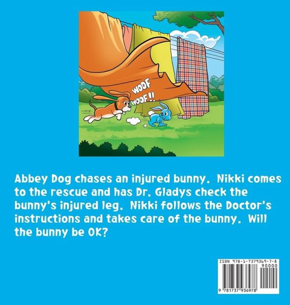 The third book in the series is about a little girl who adopts a tiny basset hound puppy and starts a whirlwind of adventures. Abbey Dog is exploring the yard and hears a loud "SQUEAK" coming from behind the blankets on the clothesline. She peeks under one of the blankets and finds a little bunny. Suddenly, Nikki hears Abbey Dog barking at something she has trapped by the staircase. Nikki rushes in to rescue the little bunny who appears to have an injured leg. Later that evening, Dr. Gladys stops by to check on the bunny. What will Nikki do? Will the bunny recover? Check out Nikki and Abbey Dog Rescue a Bunny to find out the rest of the story!