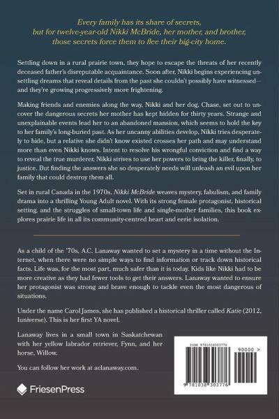 Every family has its share of secrets, but for twelve-year-old Nikki McBride, her mother, and brother, those secrets force them to flee their big-city home. Settling down in a rural prairie town, they hope to escape the threats of her recently deceased father's disreputable acquaintance. Soon after, Nikki begins experiencing unsettling dreams that reveal details from the past she couldn't possibly have witnessed-and they're growing progressively more frightening. Making friends and enemies along the way, Nikki and her dog, Chase, set out to uncover the dangerous secrets her mother has kept hidden for thirty years. Strange and unexplainable events lead her to an abandoned mansion, which seems to hold the key to her family's long-buried past. As her uncanny abilities develop, Nikki tries desperately to hide, but a relative she didn't know existed crosses her path and may understand more than even Nikki knows. Intent to resolve his wrongful conviction and find a way to reveal the true murderer, Nikki strives to use her powers to bring the killer, finally, to justice. But finding the answers she so desperately needs will unleash an evil upon her family that could destroy them all. Set in rural Canada in the 1970s, Nikki McBride weaves mystery, fabulism, and family drama into a thrilling Young Adult novel. With its strong female protagonist, historical setting, and the struggles of small-town life and single-mother families, this book explores prairie life in all its community-centred heart and eerie isolation.