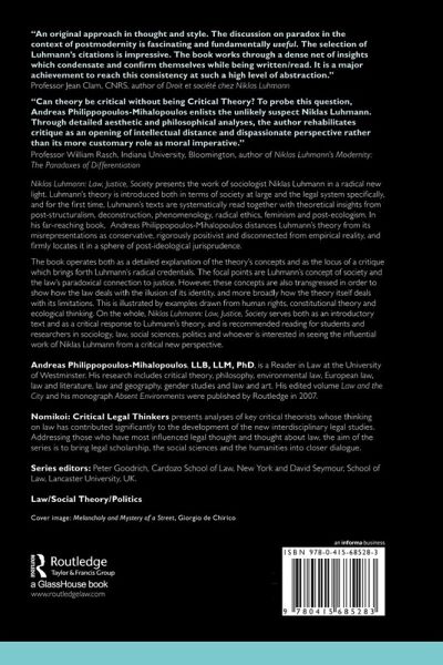 This is the first book to consider German sociologist Niklas Luhmann's social theory in a critical legal context. His theory is introduced here both in terms of society at large and the legal system specifically, and the book reveals the aporetic structure of autopoiesis, aligning it with postmodern approaches to law. Readers will find it operates both as an introduction to the relevance of Luhmann's social theory for law, as well as a critical response to autopoiesis.