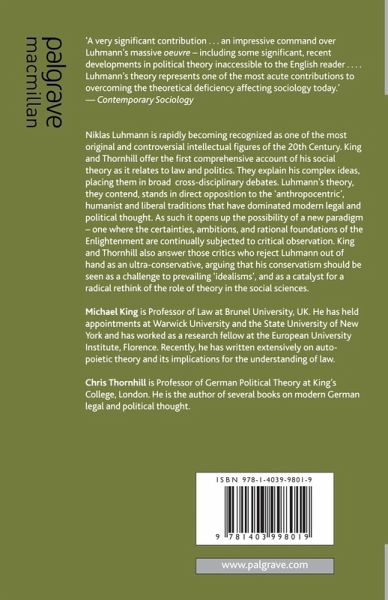'This is an excellent book. Michael King and Chris Thornhill have provided a comprehensive, scholarly and accessible account of Luhmann's extensive writings on politics and law. They have also answered convincingly many of the 'anti-functionist' criticisms that have been directed against his ideas. I have no doubt that their efforts will succeed in convincing readers of the relevance and importance of Luhmann's theory in understanding the complexity and dynamism of modern society as well as the considerable difficulties which are likely to be encountered in attempting to find solutions to the major problems facing the world.' - Professor Gunther Teubner, J.W. Goethe University, Germany