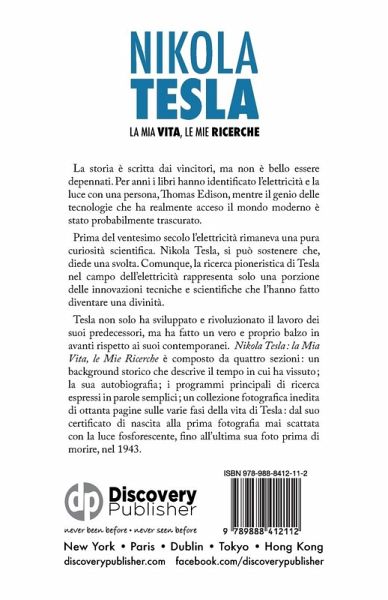 La storia è scritta dai vincitori, ma non è bello essere depennati. Per anni i libri hanno identificato l’elettricità e la luce con una persona, Thomas Edison, mentre il genio delle tecnologie che ha realmente acceso il mondo moderno è stato probabilmente trascurato. Prima del ventesimo secolo l’elettricità rimaneva una pura curiosità scientifica. Nikola Tesla, si può sostenere che, diede una svolta. Comunque, la ricerca pioneristica di Tesla nel campo dell’elettricità rappresenta solo una porzione delle innovazioni tecniche e scientifiche che l’hanno fatto diventare una divinità. Tesla non solo ha sviluppato e rivoluzionato il lavoro dei suoi predecessori, ma ha fatto un vero e proprio balzo in avanti rispetto ai suoi contemporanei. Nikola Tesla: La Mia Vita, Le Mie Ricerche è composto da quattro sezioni: un background storico che descrive il tempo in cui ha vissuto; la sua autobiografia; i programmi principali di ricerca espressi in parole semplici; un collezione fotografica inedita di ottanta pagine sulle varie fasi della vita di Tesla: dal suo certificato di nascita alla prima fotografia mai scattata con la luce fosforescente, fino all’ultima sua foto prima di morire, nel 1943.