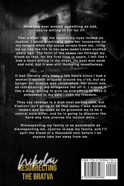 Have you ever wanted something so bad, you're willing to kill for it? That's what I felt the instant my eyes locked on Justine. I could practically taste her innocence on my tongue when she stood across from me, riling me up like the life in her eyes hadn't been snuffed years ago. The thrill of the chase ran through my blood so fast, for the first time in years, I felt like I had a heart sitting in my chest. Its beat was weak and cold, but it was still thumping nonetheless.¿ It had literally only been a few hours since I had a woman's warmth wrapped around my c*ck, but my hunger for Justine was uninhibited. Her scent was so intoxicating, my arrogance fed off it. I craved it like a drug, willing to give up everything to have it embedded in my skin-even my freedom. They say revenge is a dish best served cold, but Vladimir isn't going to be that lucky. I was maimed, beaten and tortured as he groomed me to be a natural born killer, and he is going to discover the hard way how precise his tactics were. Disrespecting my family is as punishable as disrespecting me. Justine is now my family, and I'll spill the blood of a thousand men before I let anyone take her away from me. Please note: This book was recently re-titled and re-edited. The previous titles were Nikolai: Taking Back What's Mine & Nikolai: What's Left of Me. * For TWs please visit the author's website.